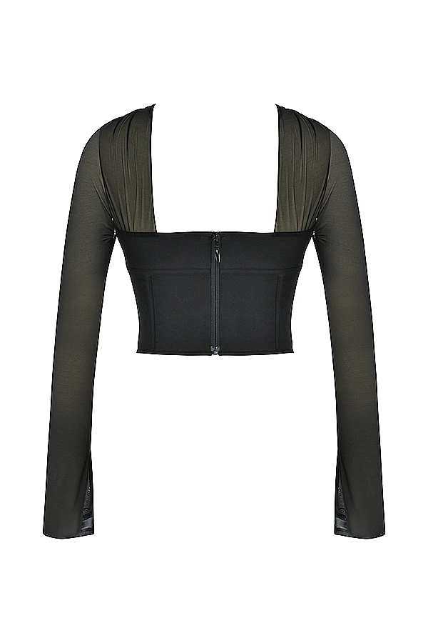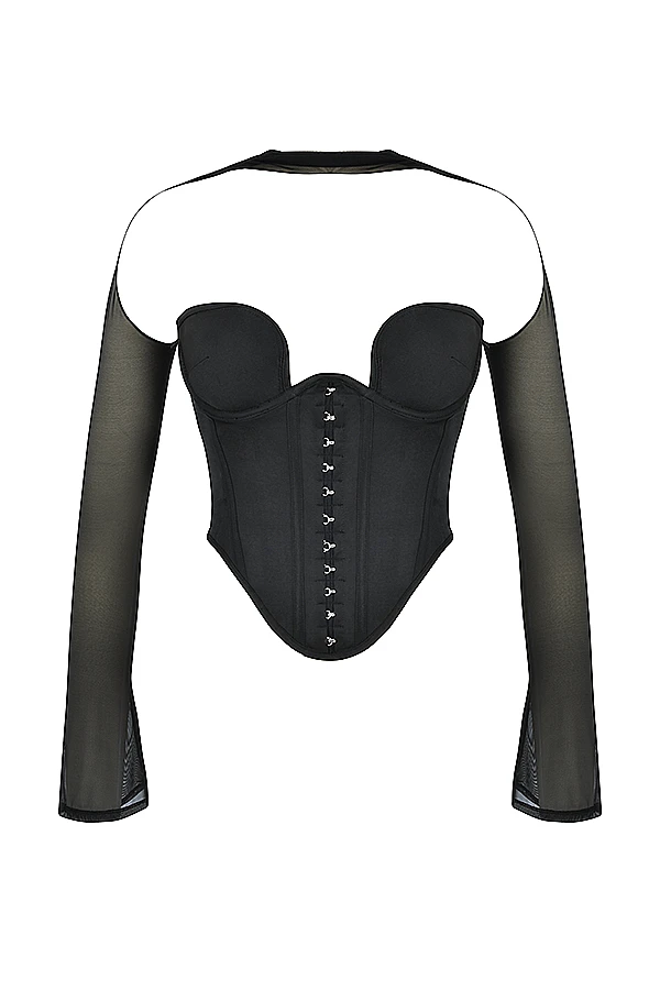 It has a longline silhouette to sit just below the waistline with hook and eye detailing to the front. The sleeves are cut from the softest stretch mesh and we love how they extend around the back of the shoulders into a halter neck to the front. It has a zip to the back fo easy on. Wear yours with our ‚Lia‘ black latex leggings to accentuate the sexy vibe. The ‚Regular Cup‘ option suits cup size A-C whilst the ‚Bigger Cup‘ option suits cup size D-E. As corsets are designed to fit snugly, we recommend sizing up if you are between sizes.