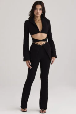 Our ‚Layla‘ black trousers are cut from a soft stretch crepe and designed with slim straps that rest gently on the hips, held by a decorative silver ring to create a cool cutout effect from the low v-shape waist. They have a fitted straight leg silhouette with a zip to the back for easy on and the exposed seams accentuate the style. Wear yours with our ‚Nour‘ cutout blazer to show off the details.
