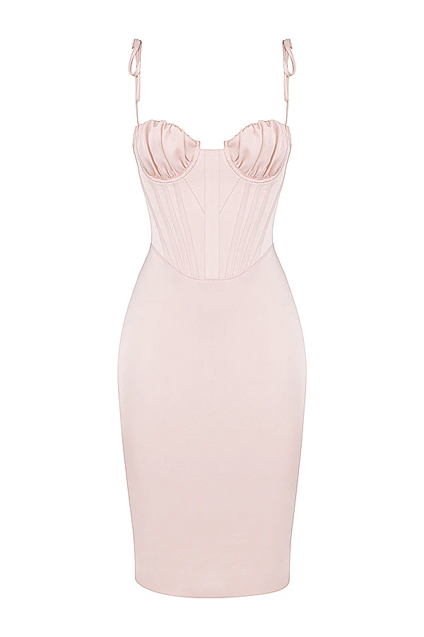 ‚Alma‘ is sleek and elegant. Cut from our lustrous silk satin, this knee length style features our corsetry boning to the bodice to really cinch the waist and the pretty gathered cups are underwired for full support and uplift. The delicate spaghetti straps tie to the shoulders and the close fitting skirt hugs your curves to flatter your figure.
