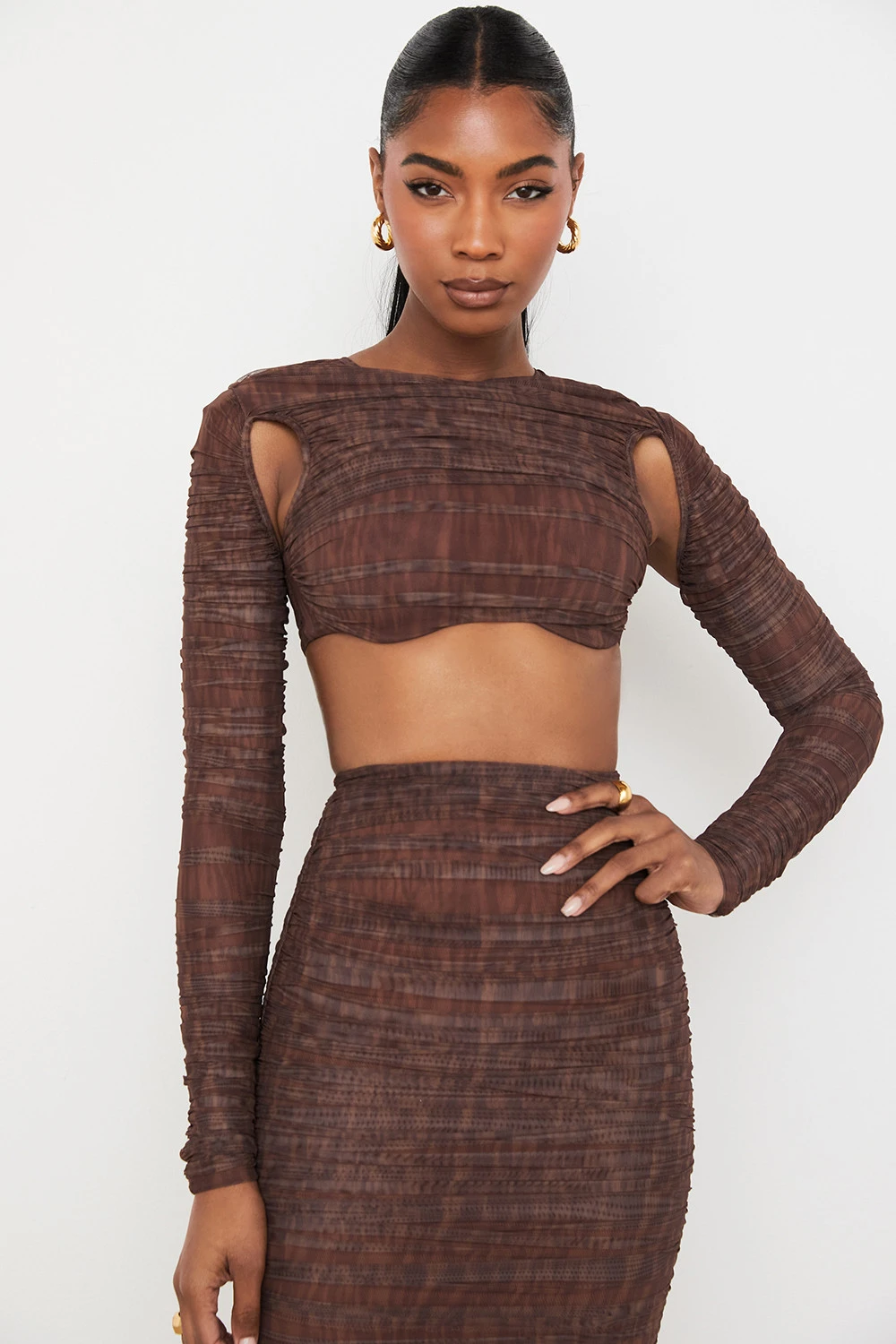 We love how the underwired cups peep just below the cropped hem and the side corsetry boning to snatch and add extra support. It has a zip to the back for easy on. Wear yours with our matching ‚Laverne‘ Chocolate Print Ruched Maxi Skirt as our designers intended for a super cute put together look.