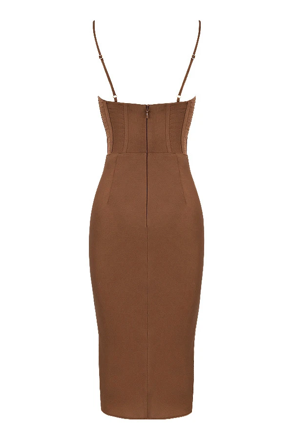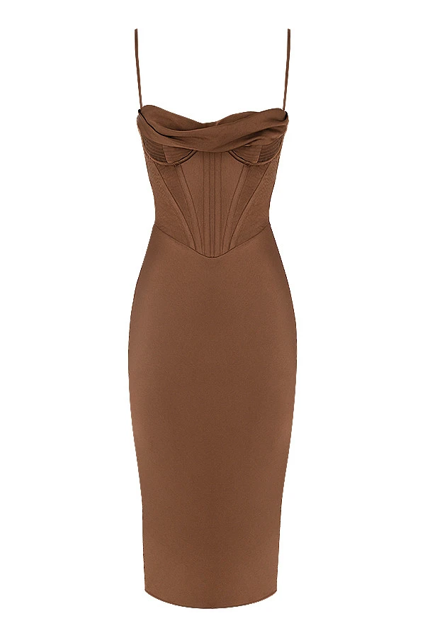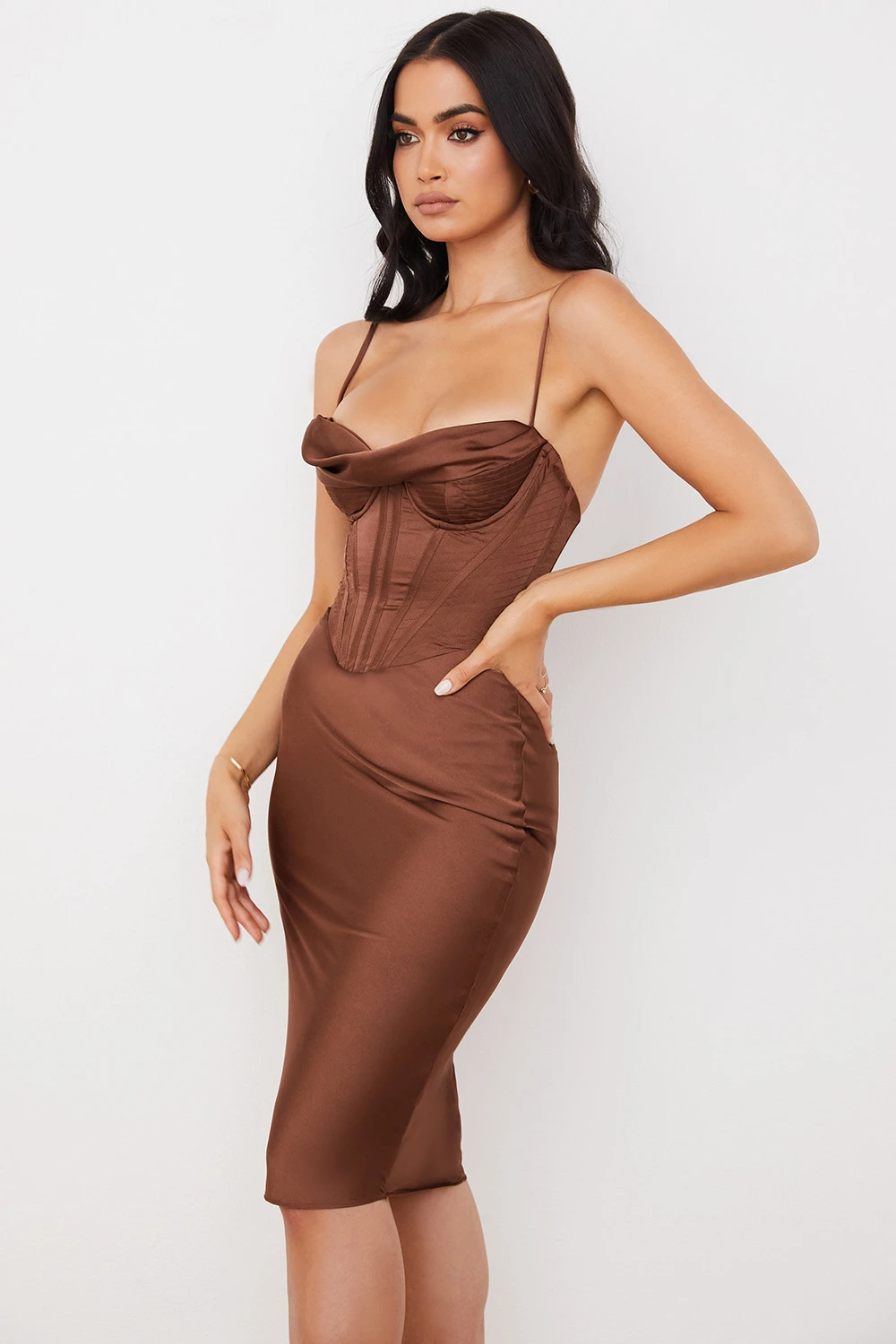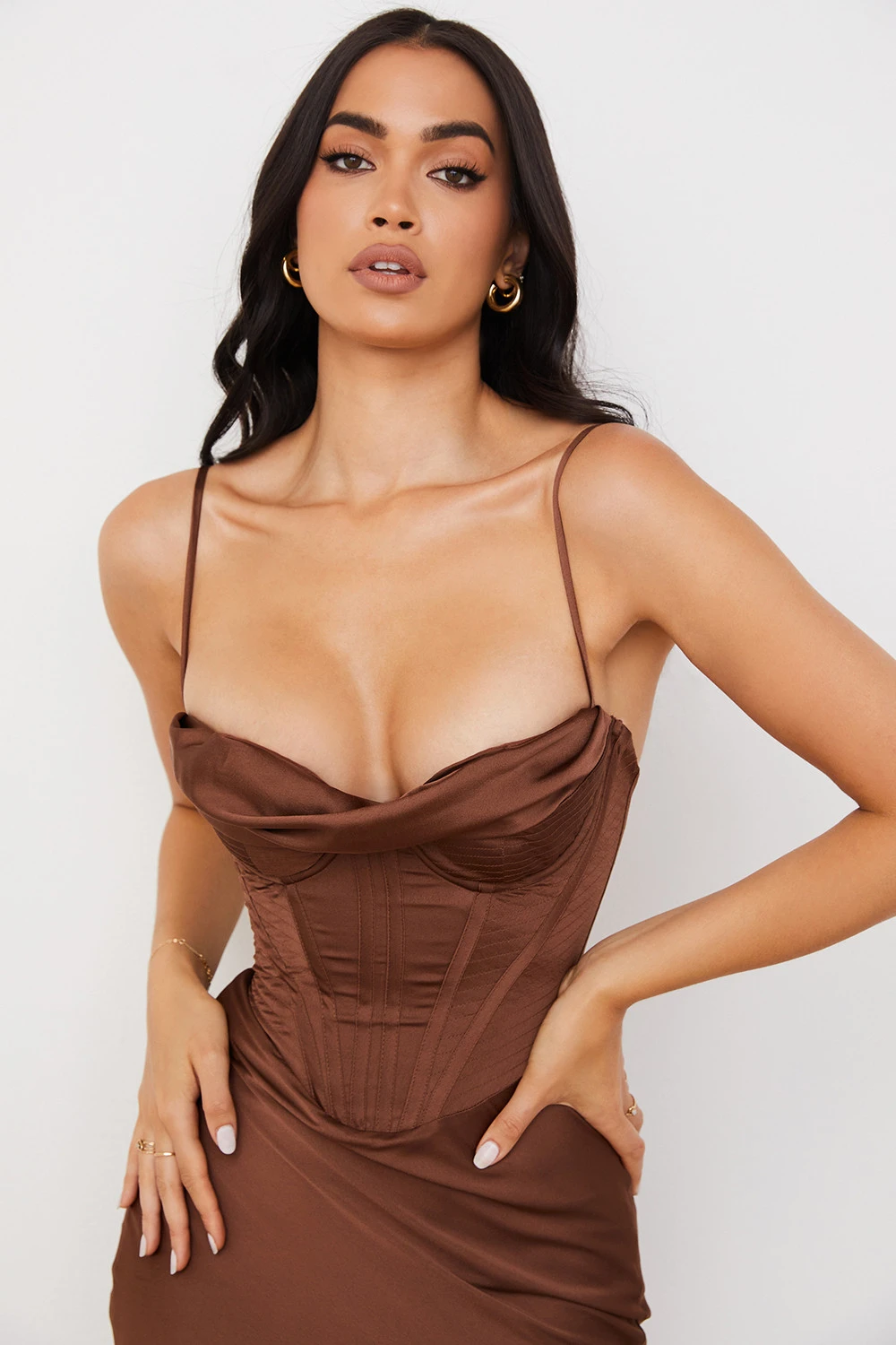Delicate and dainty, HouseofCB updates the timeless slip dress with a beautifully draped cowl neckline. ‚Myrna‘ is made from our lustrous silk satin in a rich chocolate brown and is cut on the bias for a beautiful drape and figure skimming silhouette. The bodice features our incredible corsetry boning to really cinch the figure in and is fully lined in a textured fabric for a non slip hold.