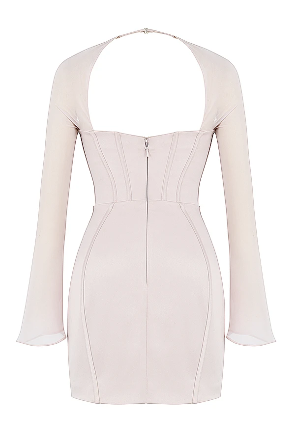 Our ‚Isra‘ mini dress showcases the figure beautifully in a lustrous crystal toned satin for a close fit and features our incredible corsetry boning to cinch the waist for the perfect silhouette. ‚Isra‘ has lightly padded, underwired cups to uplift and flatter the bust and we love how the halter straps attach to the off shoulder sleeves at the back of the neck and fall to dramatic fluted cuffs, cut from our lightweight georgette.