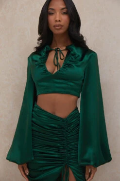 ‚Vandra‘ has the perfect balance between cool and elegant. It’s cut from our lustrous duchess satin in a deep evergreen tone. The bodice has a close fitting feel with enough room for movement. It has a cropped silhouette with a centre front opening from the neck to the underbust seam with gentle ruching to the front and slim ties for you pull in those beauties to create the perfect cleavage. We love the way the balloon sleeves add just the right amount of drama to this already perfect design. It is fully lined in a super soft stretch satin and has a zip to the back for easy on. Compliment the cropped hem with our ‚Petronella‘ skirt as our designers intended for an ultra chic look this season.