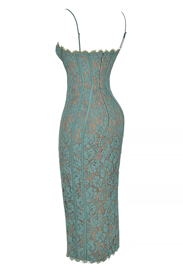 If you loved our ‚Lala‘ mini dress you’ll love our midi length version, ‚Joelle‘. Cut from a delicate lace in a fresh forest hue and backed in our figure enhancing power mesh for modest coverage and the closest of fits. ‚Joelle‘ features a pretty sweetheart neckline with balconette cups that are underwired for the utmost support and flattering uplift. The bodice is boned throughout to cinch the waist and the satin shoulder straps adjust for the perfect fit.
