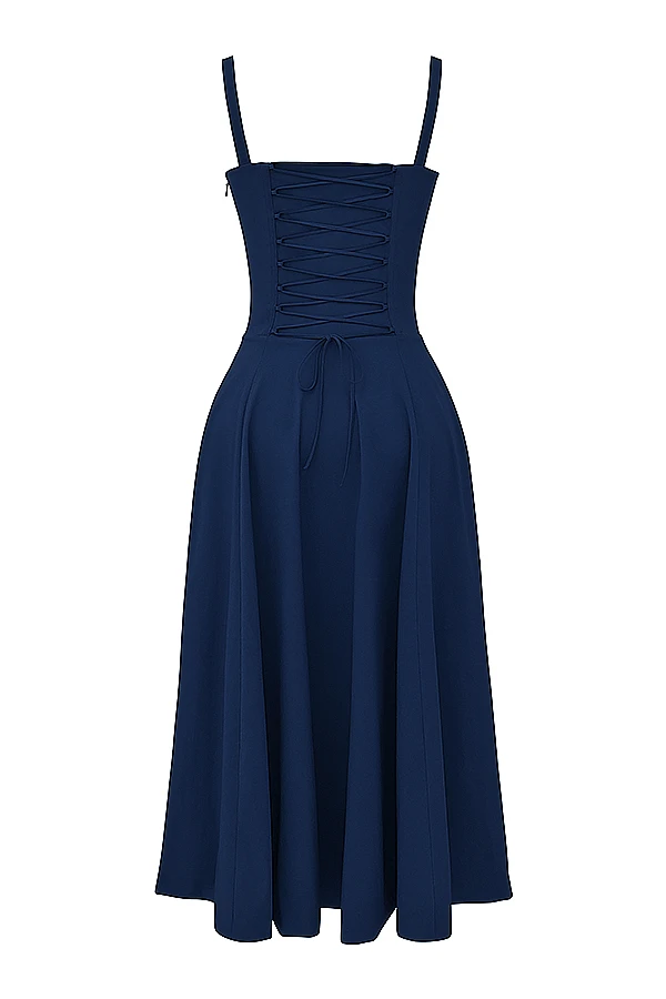You’ll feel ultra feminine in our ‚Carmen‘ dress that’s the perfect match for romantic date nights. It’s cut from stretch cotton in a gorgeous navy hue and has a corseted bodice to cinch the fit with a beautiful lace up back. The gathered bust has a drawstring tie and the side split adds a little sexiness to reveal a flash of leg.