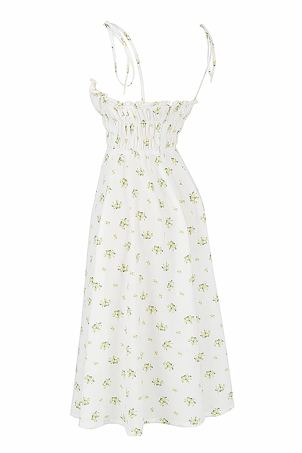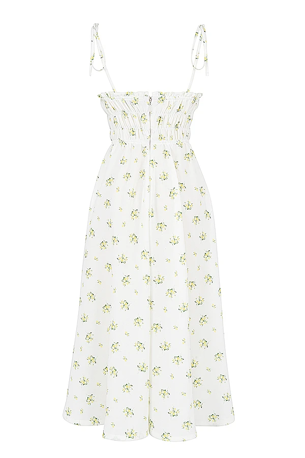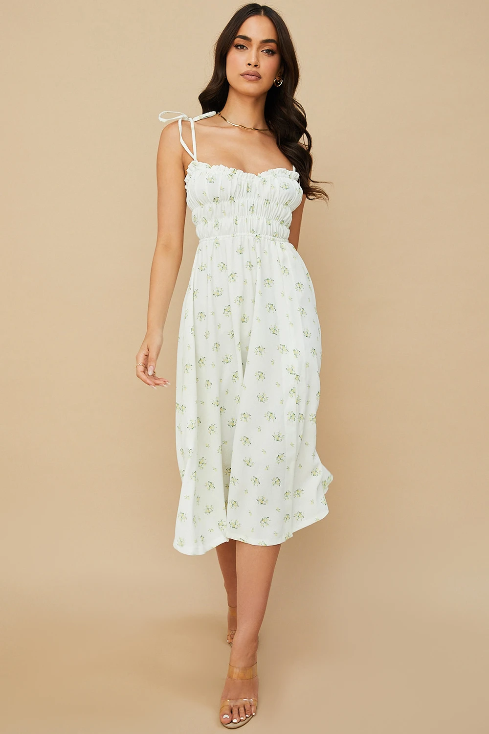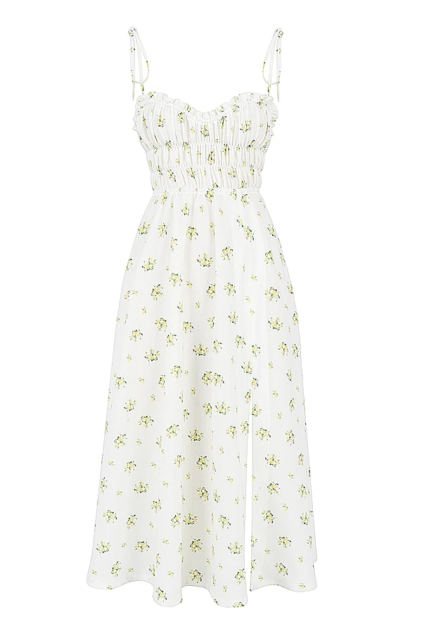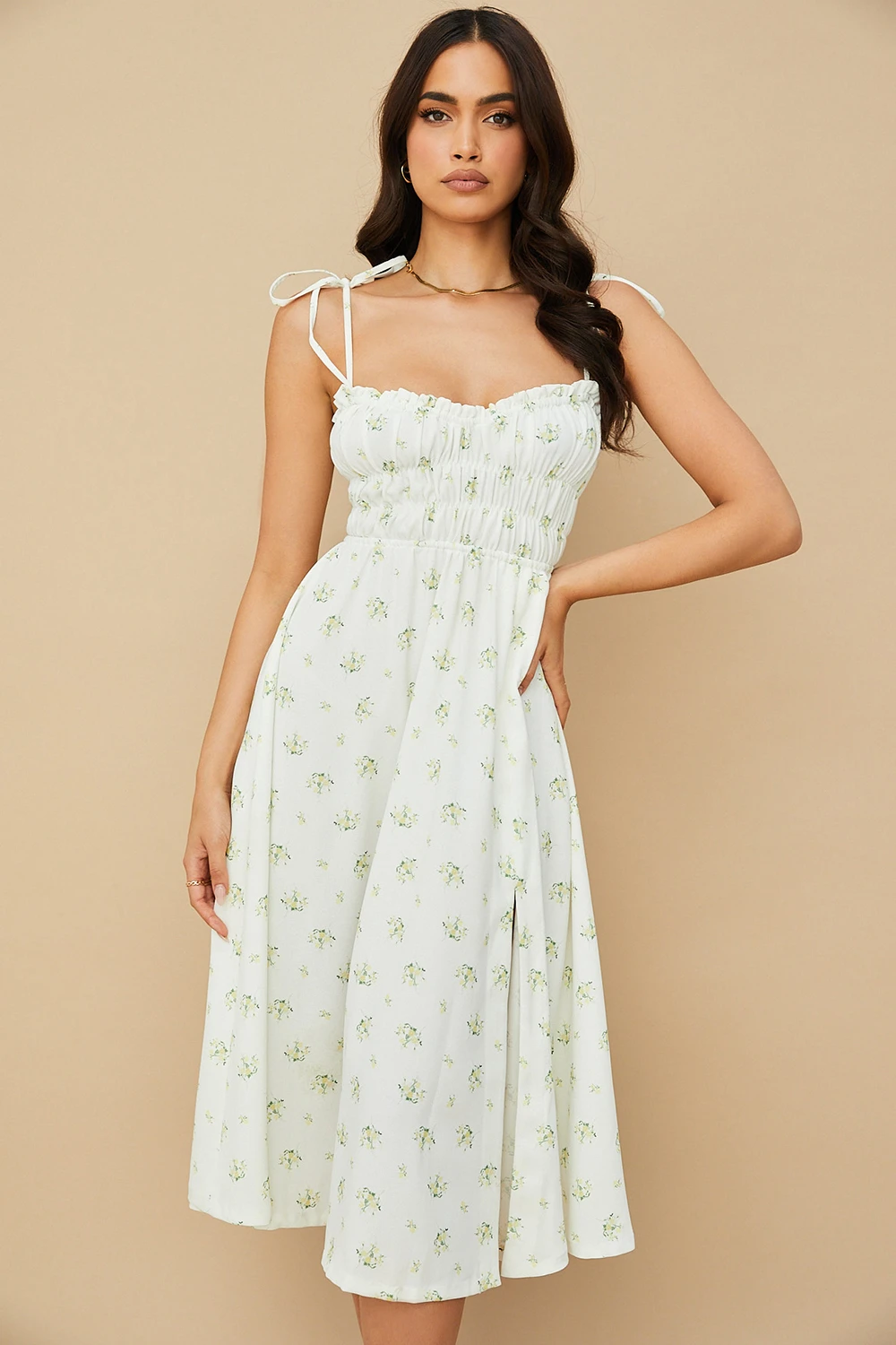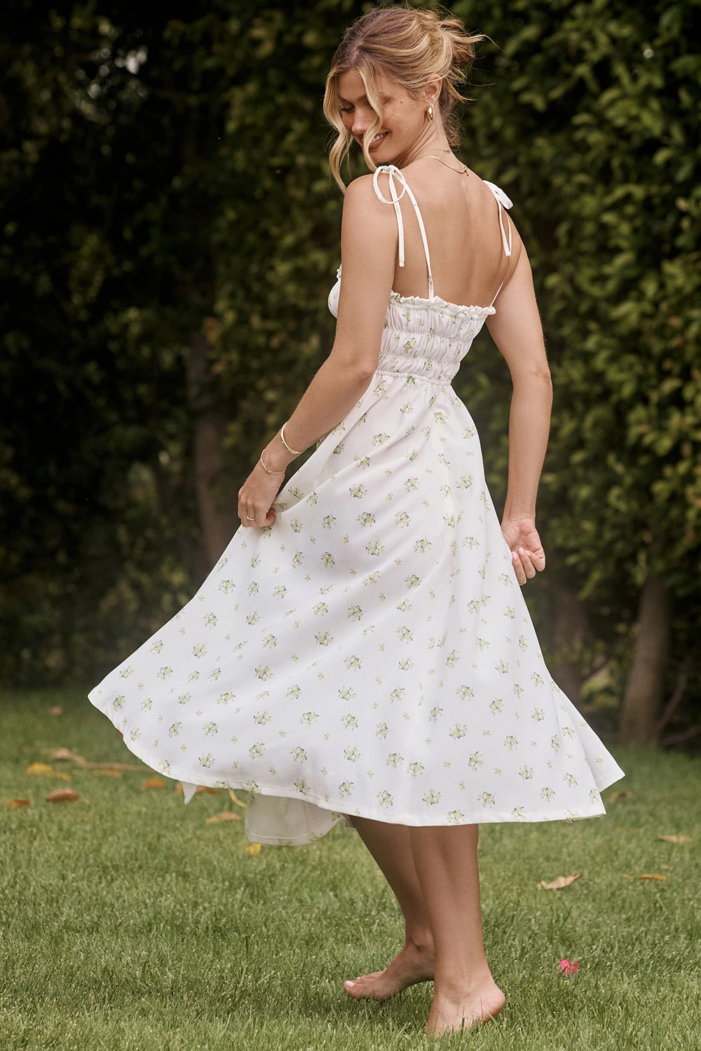 ‚Christabel‘ is a pretty option for so many occasions – think garden parties and pretty picnics. Made from a lightweight crepe and patterned with floral blooms, it has a shirred bodice that cinches the waist with tie fastening shoulder straps and the skirt falls to a floaty midi hem with a side split to flash a little thigh. We love this with neutral heels like ‚Lucent‘ Clear Strap Beige Suede Mules.