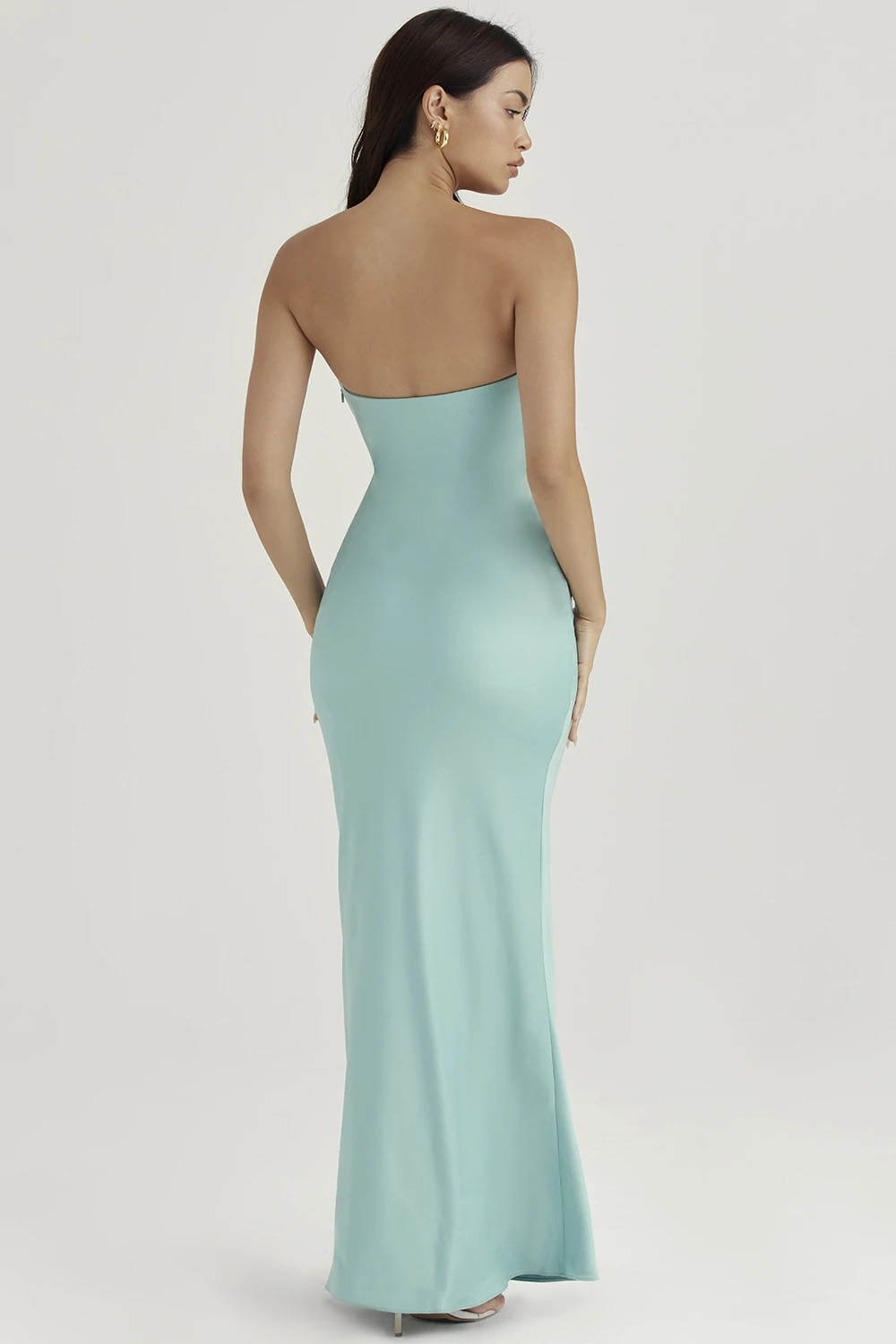 Simple elegance is what we love about ‚Alette‘. It’s cut on the bias from an ultra light duchess satin for a luxurious feel in a striking jade hue that drapes so beautifully over your frame. The strapless neckline highlights your decolletage that’s perfect for showcasing a delicate necklace.