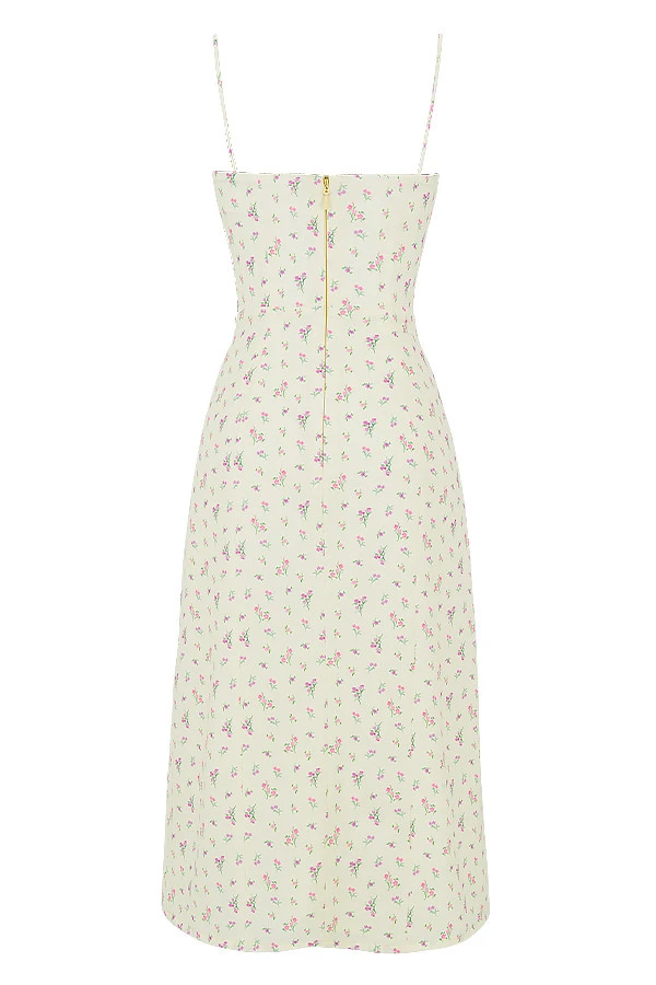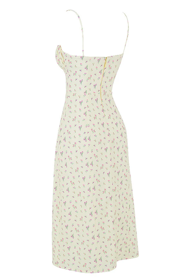 ‚Carina‘ is ultra feminine and perfect for transitional spring and summer dressing. It’s cut from a weighty fabric that hangs beautifully and has a ditsy lemon floral pattern. The pretty gathered bust fastens with a drawstring tie and the side split adds a little sexiness. It’s fully lined as usual and we love this teamed with delicate heels like ‚Lucent‘ Beige Clear Strap Mules.