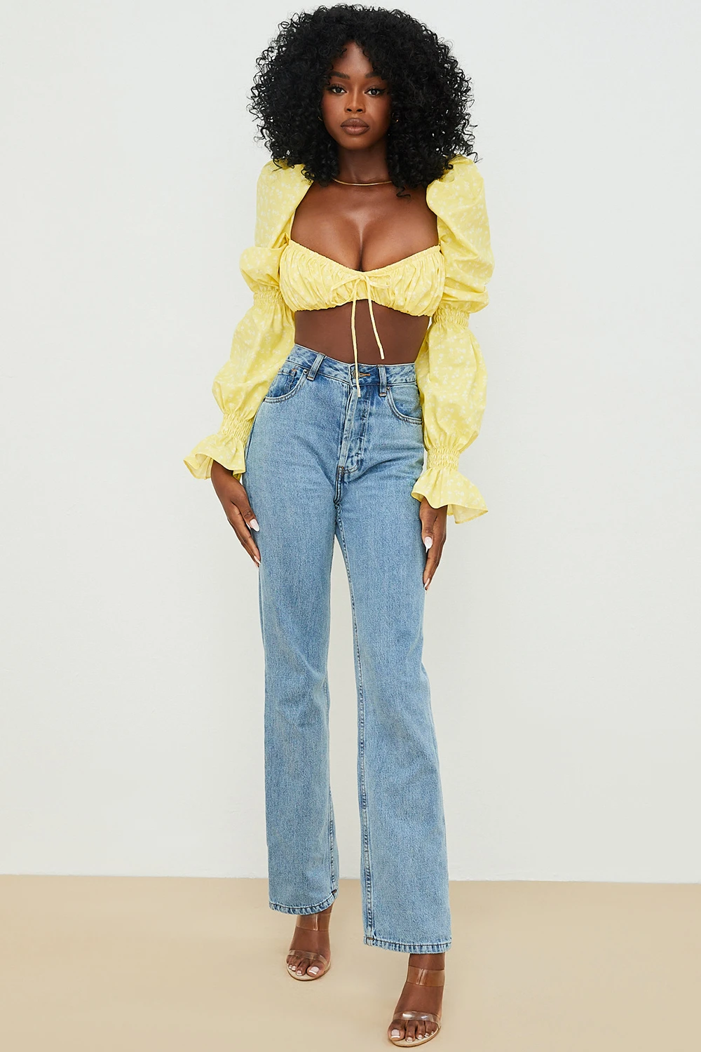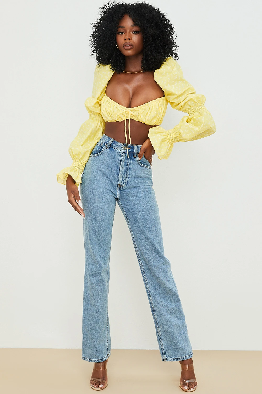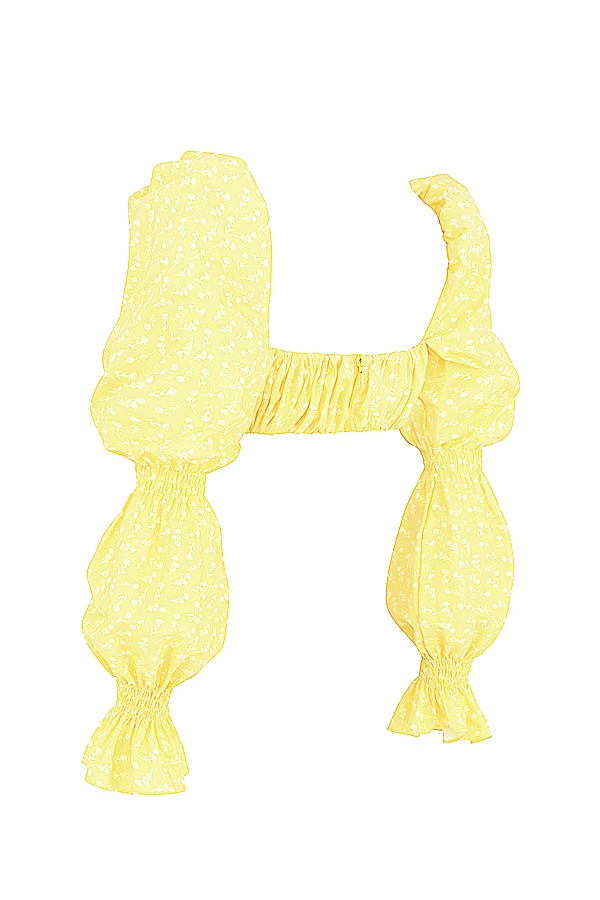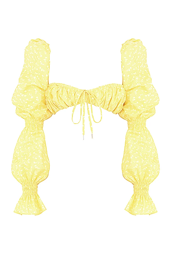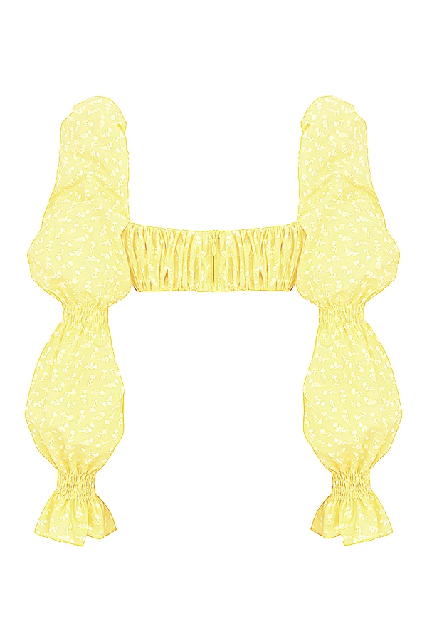 Cut from our crisp and fresh cotton poplin in a pretty lemon floral, ‚Henrietta‘ is perfect for sunny days. It has a cropped bralette style that stretches for a secure fit and the pretty long sleeves are shirred to the wrist and elbows. The front has a drawstring to the bust and we love the pretty puff shoulders. The cups are fully lined for comfort and we think that ‚Henrietta‘ looks great with denim.