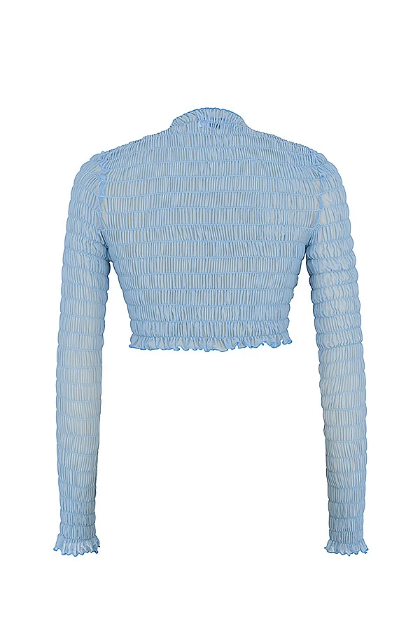 ‚Delight‘ is cut from soft stretch mesh that’s shirred throughout the bodice for a slim yet flexible fit and features a pretty frill edging, a high neckline with long sleeves and a cropped hem. ‚Delight‘ is a pull on piece and is suitable for any bust size as it as no cups. Wear yours with our ‚Smiles‘ mini skirt as our designers intended and tonal mules.