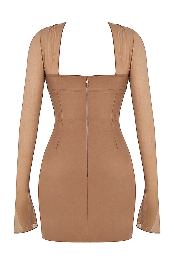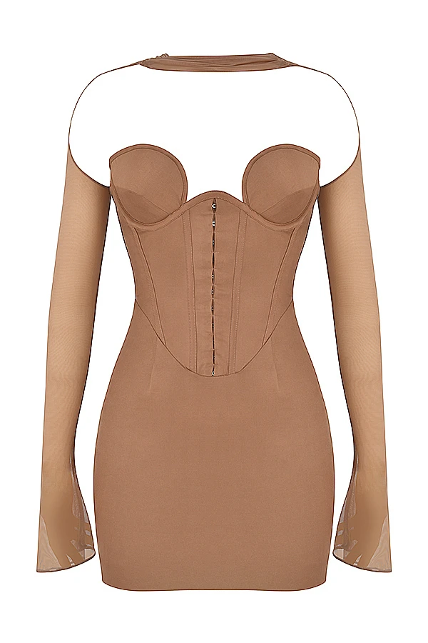 Theres nothing quite like a new dress and our ‚Mayara‘ mini dress has the perfect balance of sexy and stylish. Cut from a crisp cotton twill in a gorgeous mocha hue, the bodice has a longline silhouette that dips just below the waistline with hook and eye detailing to the front and features our signature corsetry boning to really cinch the waist with underwired cups that are lightly padded to enhance the bust for the most amazing cleavage.