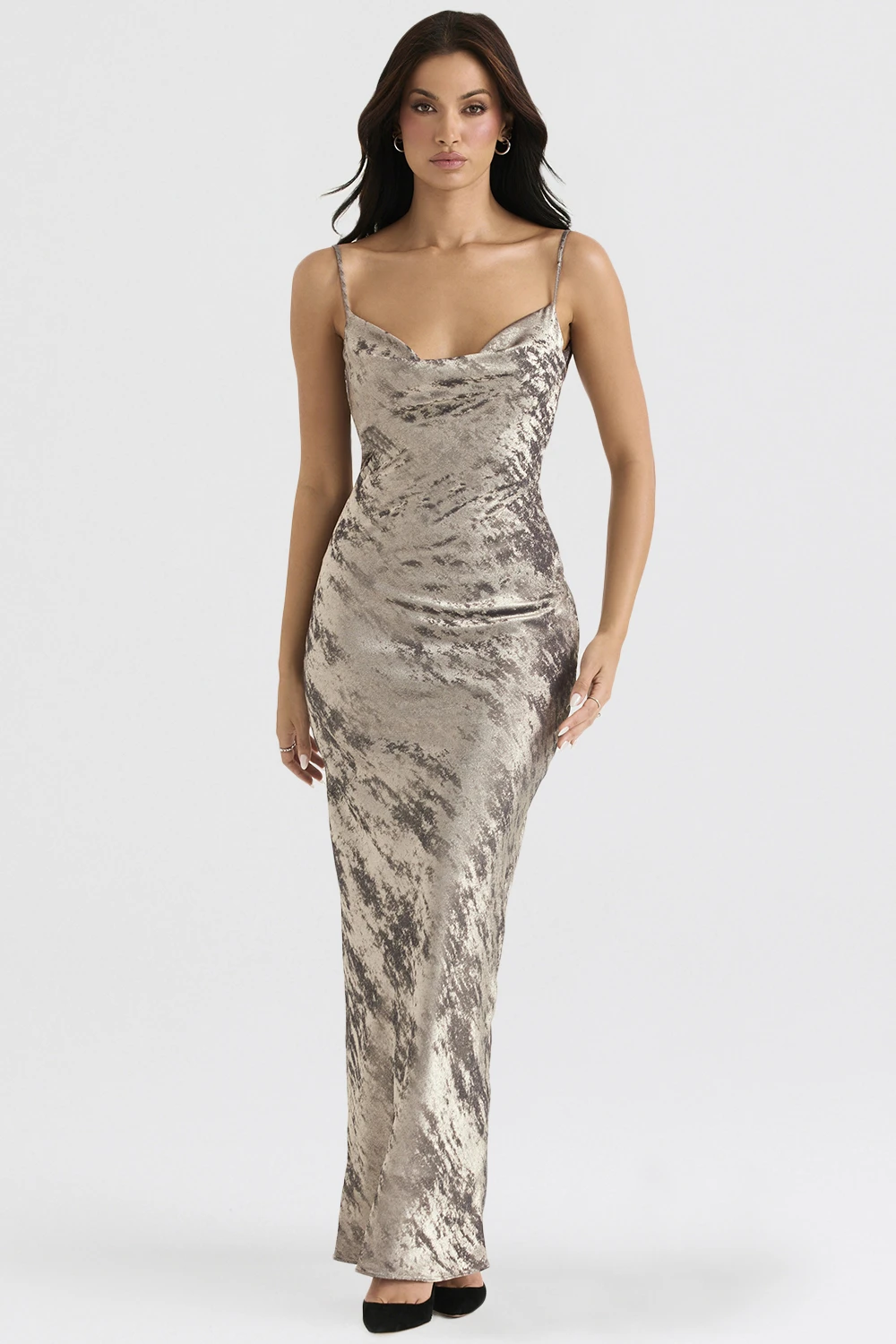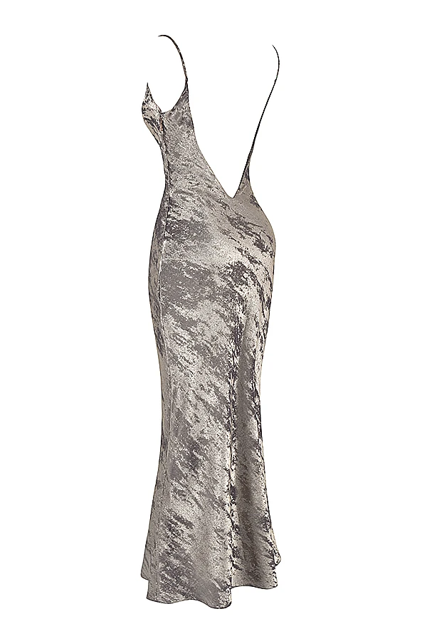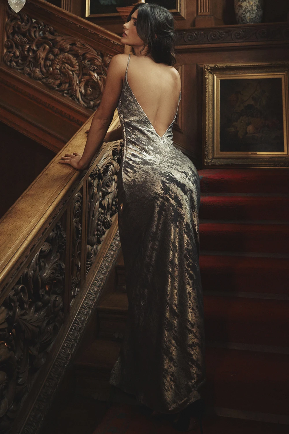 Our ‚Gabrielle‘ dress is effortlessly elegant and a glamorous choice for your next special event. Cut from an ultra luxe lurex satin in a metallic Pewter hue that catches the light beautifully and fluidly skims your figure.