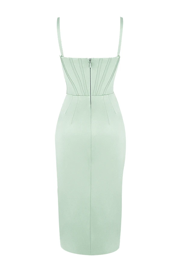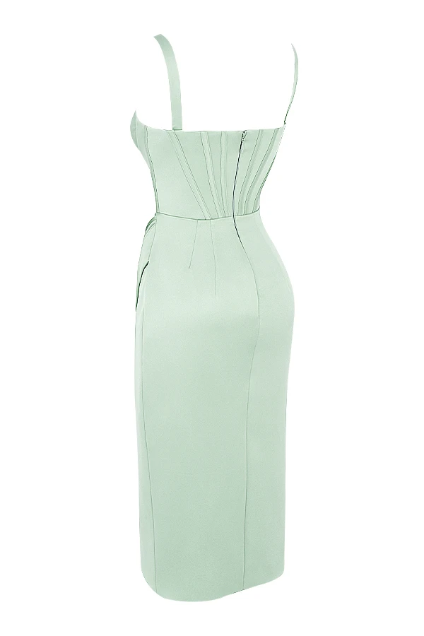 Our ‚Faye‘ dress is equally feminine and flattering with a touch of elegance. Made from our ultra luxe duchess satin in a beautiful pistachio green, ‚Faye‘ has a plunging neckline with pretty petal shape pleated cups, framed by slim straps. The bodice has our special corsetry boning to ensure the utmost support and gives the bust a volumising lift for the ultimate cleavage. The internal layer is lined in a stretch woven fabric for a non slip hold.