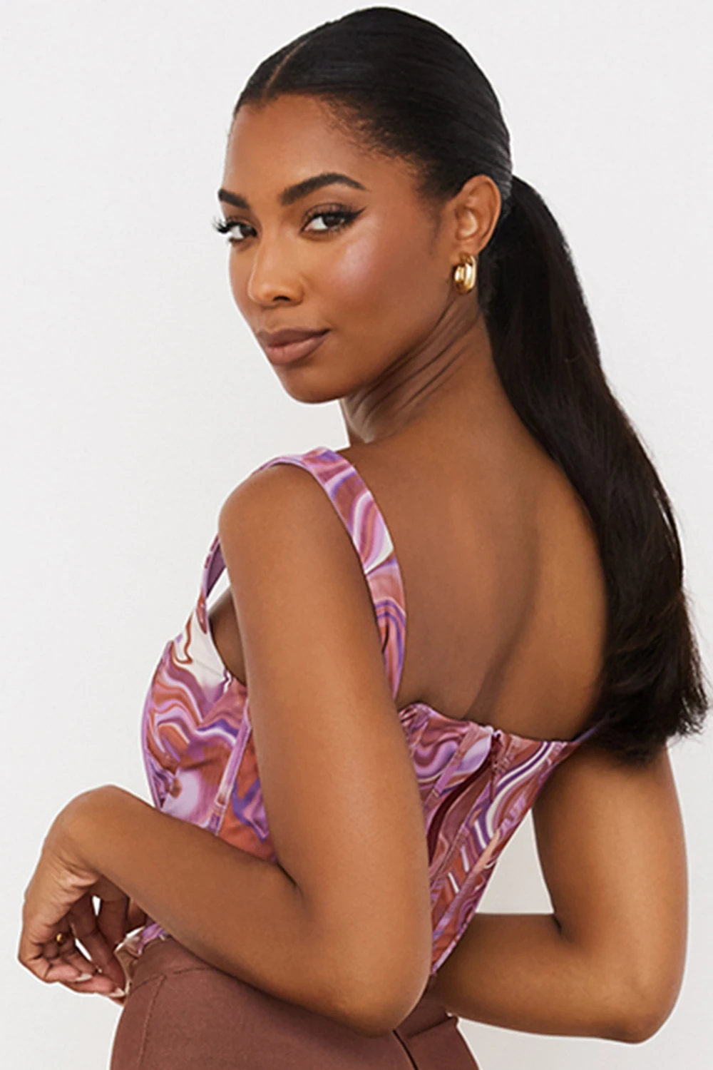 Our ‚Ninetta‘ corset is beautifully crafted from a stretch power mesh in a pretty purple swirl print to welcome in the spring and summer season. Inspired by traditional corsets, it’s boned to create an hourglass silhouette and has a square neckline that flatters the bust.