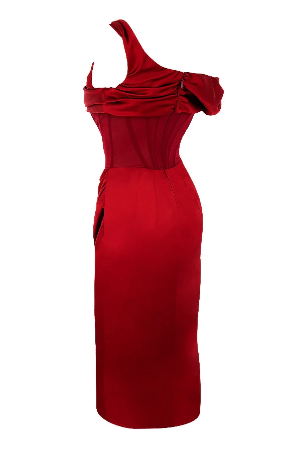 ‚Lulu‘ is our super sexy and stylish one shoulder drape creation with a touch of elegance in a seasonal wine tone. Crafted from our ultra luxe duchess satin featuring our special boned corsetry that gives ultimate support for a sculpted fit. The internal layer is made from our special stretch power mesh that sculpts the figure from within and acts like shape wear but is built into the garment. It is boned through the front and back and features additional ’side boob‘ boning to create the most flattering cleavage by pushing together and uplifting the bust. We love the way the right sleeve drapes sexily off the shoulder and the dipped v-shaped hem that meets the skirt as it gathers to the hip creating the ultimate flattery to the tummy and hips. The skirt split flashes a hint of thigh for a super feminine vibe. Fully lined for a smooth comfy feel. Perfect for all parties and festive events worn with our ‚Ghost‘ sandals.