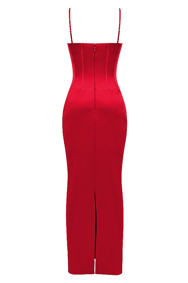 Classy and elegant, our ‚Shani‘ dress evokes Old Hollywood with its lustrous red satin and vixen vibes. It’s designed for a figure skimming silhouette and features our incredible corsetry boning to snatch the waist and highlight your cleavage. The semi sheer mesh sides adds an additional dash of daring.
