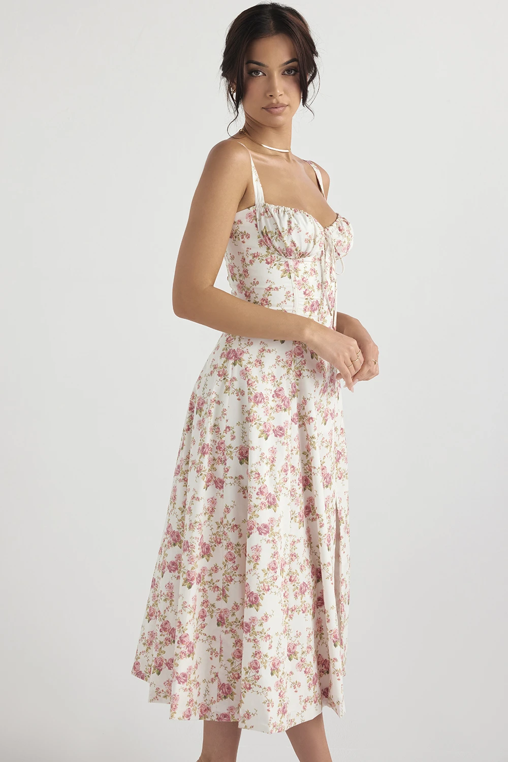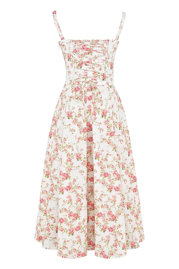 You’ll feel ultra feminine in our ‚Carmen‘ dress that’s the perfect match for summer garden parties. It’s cut from stretch cotton in the prettiest floral print and has a corseted bodice to cinch the fit with a beautiful lace up back. The gathered bust has a drawstring tie and the side split adds a little sexiness to reveal a flash of leg.
