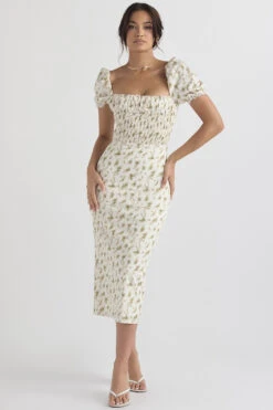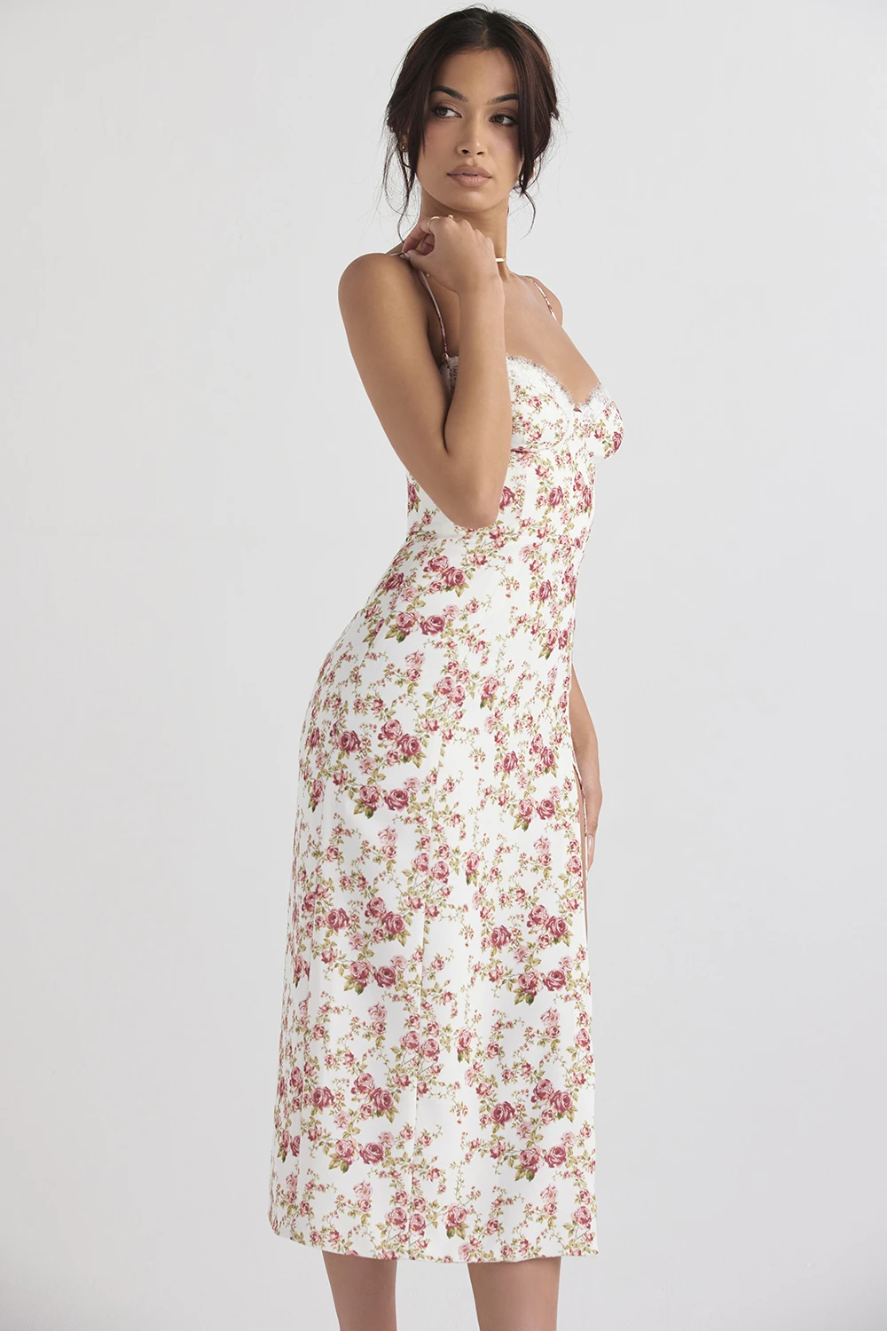 What feels more like summer than a pretty floral dress. Cut from our lightweight crepe that hangs beautifully, ‚Charlotte‘ has a rose print that’s even more beautiful close up with a flattering sweetheart neckline, edged in delicate lace and the bodice is fitted with our signature corsetry boning for a tiny, cinched waist. The shoulder straps adjust for the perfect fit and we love the daring side split to add a little sexy to the vintage style.