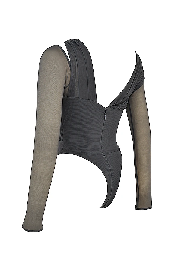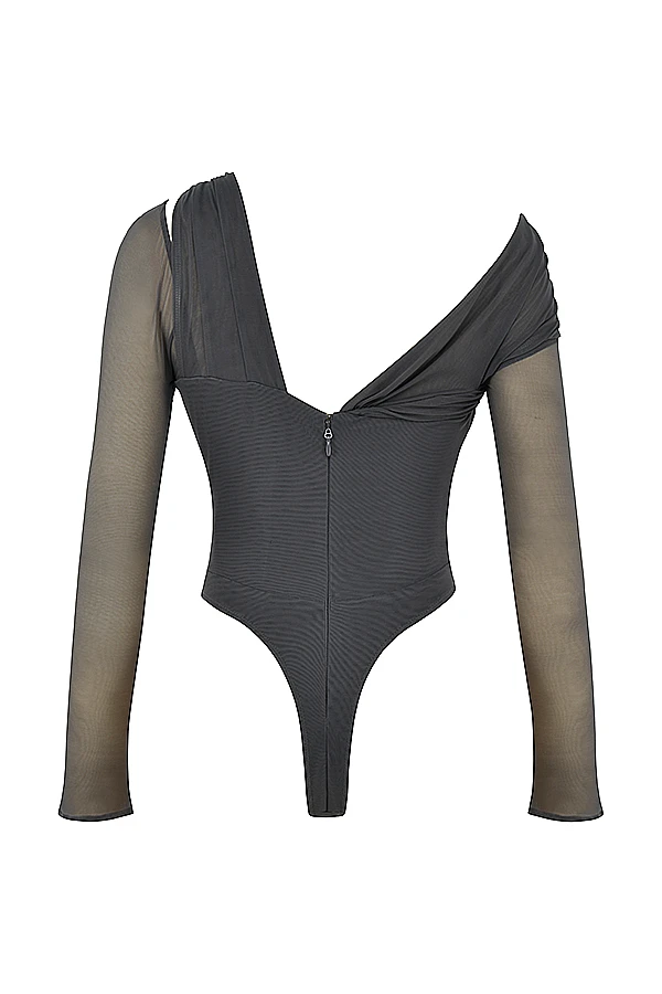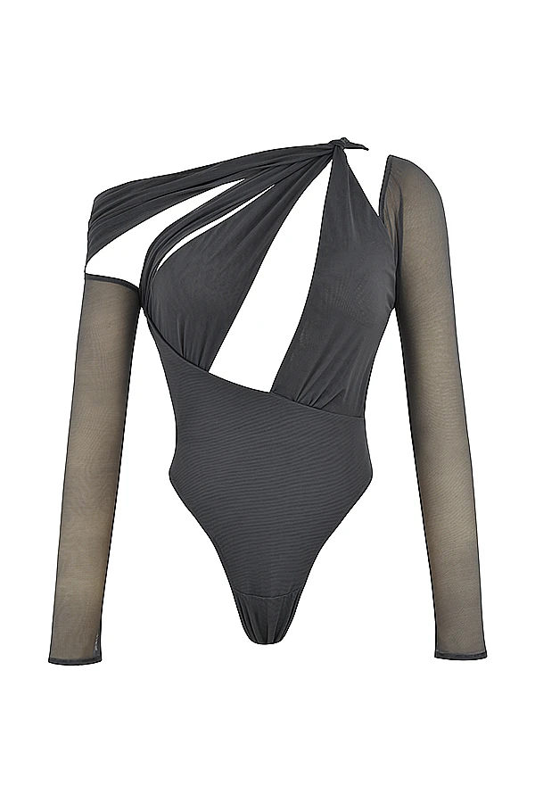 ‚Lilah‘ has been designed to highlight and flatter the female figure. This strategically layered and cutout bodysuit is cut from stretch mesh with an inner layer of our special power mesh to the body to snatch the fit from within, acting just like shapewear. We love the unique asymmetric neckline and open front to reveal a bust flattering cleavage with extended long sheer mesh sleeves that graze the knuckles.