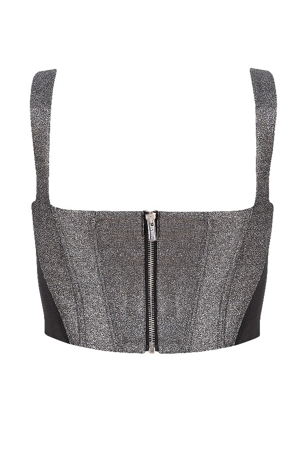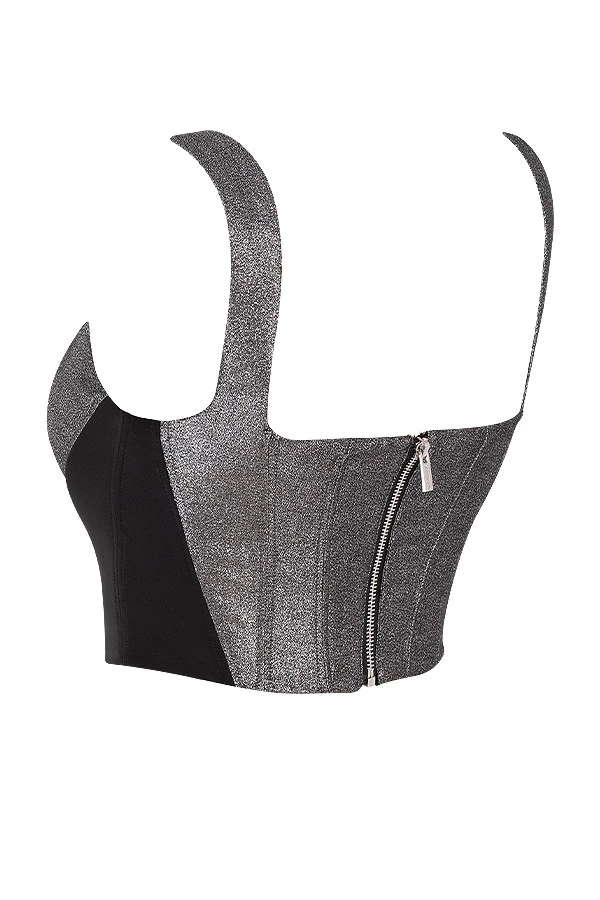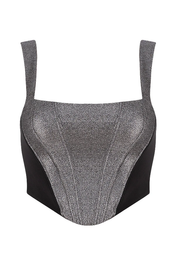 Cut from our stretch crepe with a silver glittered finish, our ‚Hannah‘ corset top really accentuates your curves. It’s beautifully crafted and boned throughout and features duchess satin trims to the sides and back. The corseted structure supports the bust so you don’t need a bra and the balconette cut is ultra flattering. It’s fully lined for a smooth and comfortable fit andfeatures a dipped hem to sit nicely over those casual jeans for a night out with the girls. As corsets are designed to fit snugly, we recommend sizing up if you are between sizes.