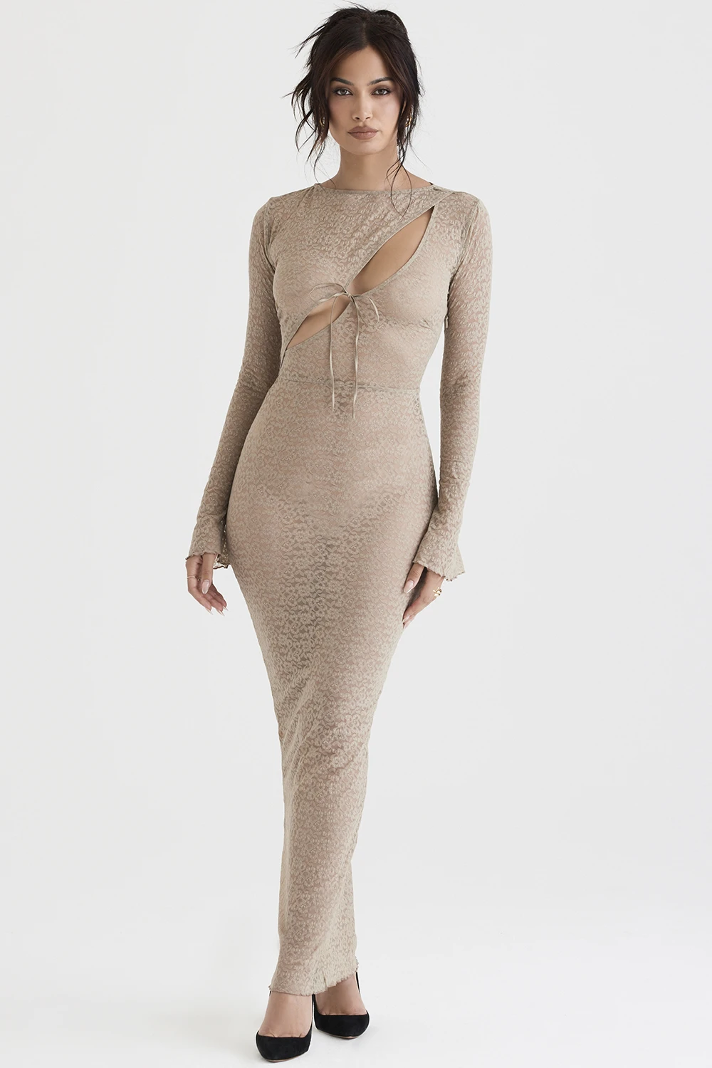 ‚Giovanna‘ is our soft and sexy, feminine creation that’s the perfect date night dress. Designed in a romantic sheer floral mesh lace with a high neckline and long sleeves. It’s spliced through the chest with a delicate lace trim along the front opening and held together with satin ties.