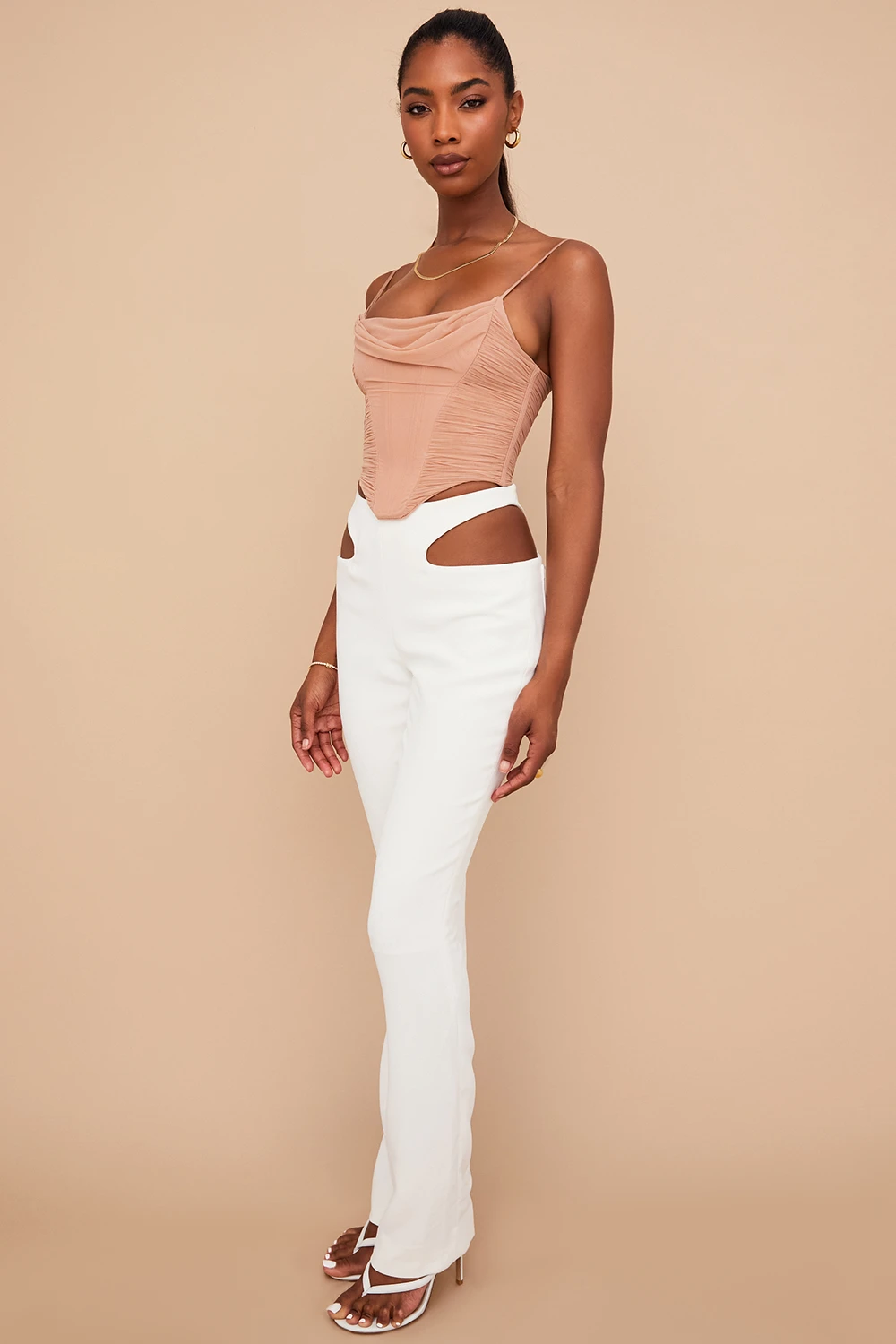 Unique design elements is what houseofcb is all about and our ‚Osaka‘ trousers are the perfect example. They are cut from a stretch crepe that has a distinctive wrinkled appearance and designed to flatter from every angle. ‚Osaka‘ are defined by scoop cutouts to the hips for a super sexy and feminine vibe with a curved waistband that sits comfortably at the natural waist with a zip to the back for easy on.