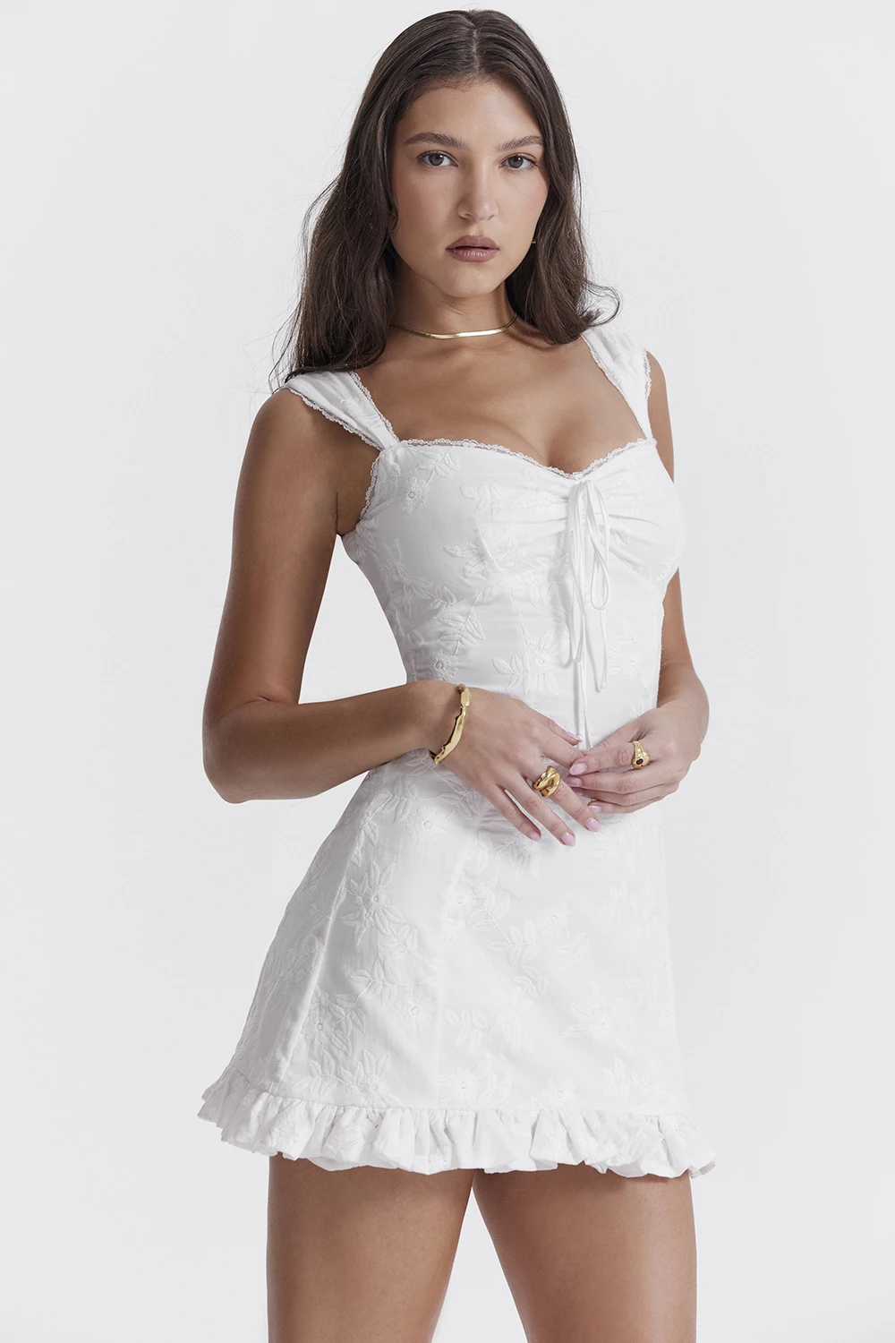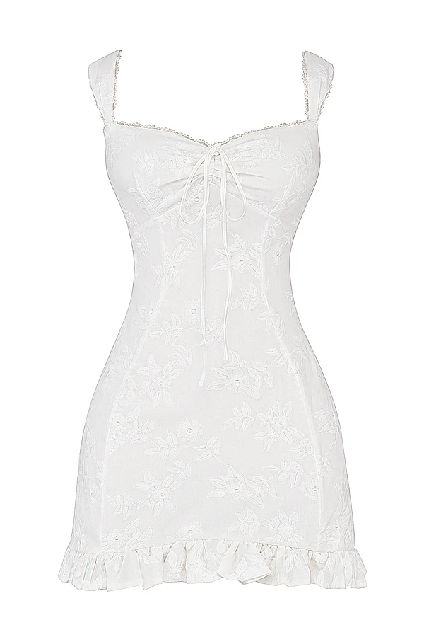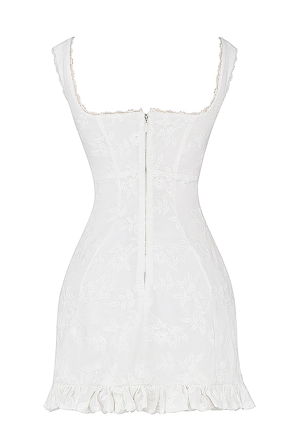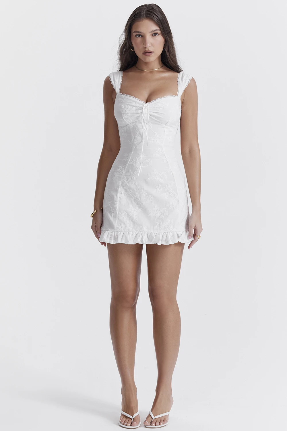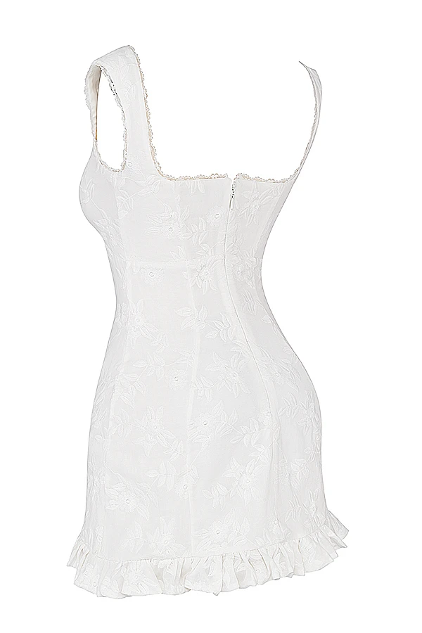 The thigh grazing cut features the prettiest ruffle hem in a flattering a-line shape and it zips up the back for easy on. We love this paired with dainty heels like ‚Lola‘ in white. The ‚Regular Cup‘ option suits cup size A-C whilst the ‚Bigger Cup‘ option suits cup size D-E.